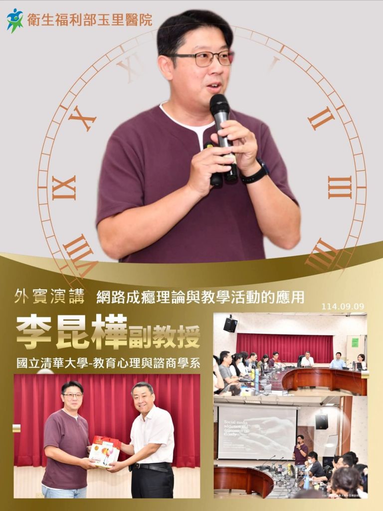 隨著數位時代快速發展,網路成癮已成為全球關注的心理健康議題。為提升專業人員對此現象的認識與應對能力,衛生福利部玉里醫院特舉辦專題講座,特別邀請臺灣網路成癮防治學會理事長、清華大學李昆樺副教授蒞院演講,分享「網路成癮理論與教學活動的應用」,吸引院內外醫療團隊與心理專業人員熱烈參與,玉里醫院簡以嘉院長也到場支持並致贈伴手禮,進行專業交流。
