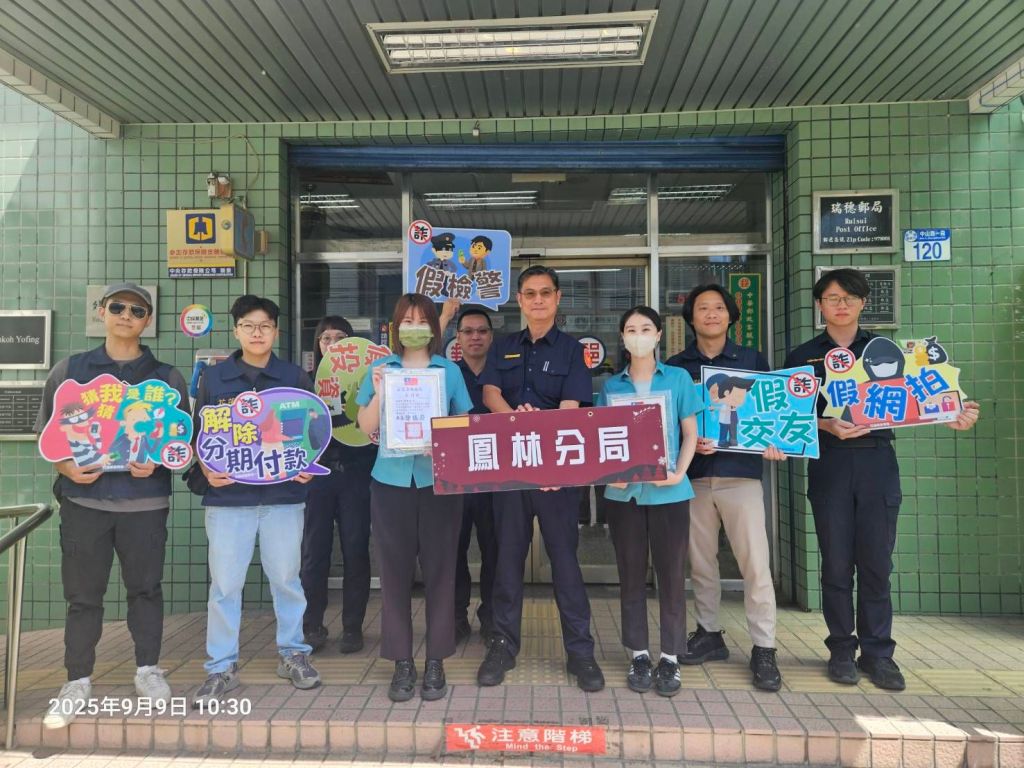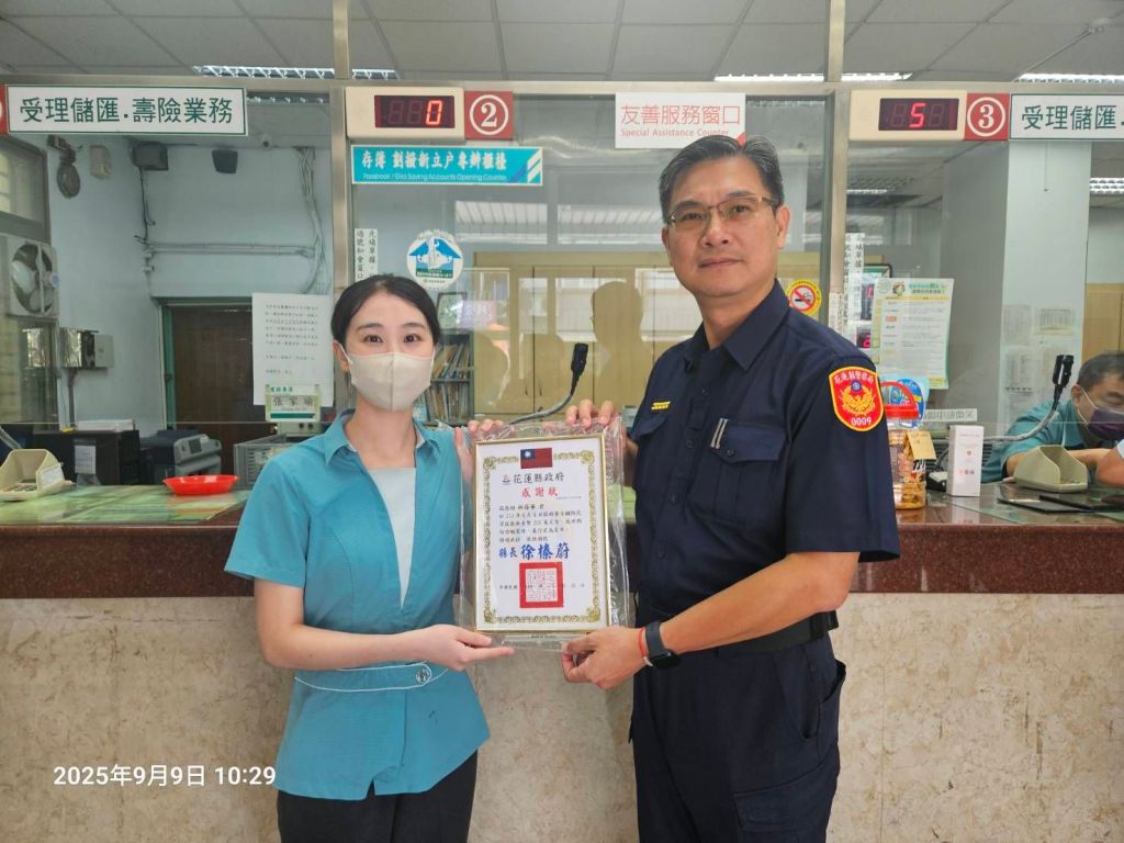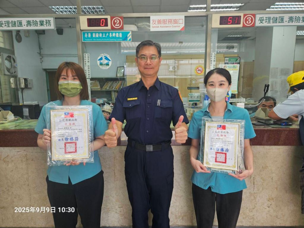 為守護民眾財產安全,花蓮縣警察局鳳林分局與瑞穗郵局攜手合作,於114年6、7月間成功攔阻多起詐騙案件,合計保住民眾新臺幣200萬元財產。鳳林分局長劉玉祥特於近日率領偵查隊長吳泓修及偵查隊同仁,親赴瑞穗郵局頒發感謝狀,表彰郵局行員的機警與熱心,展現警民聯防的卓越成效。