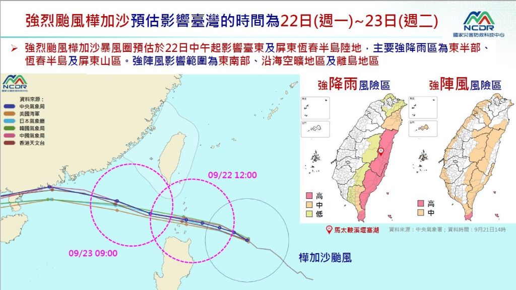 樺加沙颱風中心22日8時的中心位置在北緯 19.3 度,東經 123. 1 度,即在鵝鑾鼻的東南方380公里處,以每小時19轉22公里速度,向西轉西北西進行。花東地區有局部大豪雨機率,局部地區有平均風速6級以上或陣風8級以上發生的機率,請留意局部大雨或強風發生機會。
