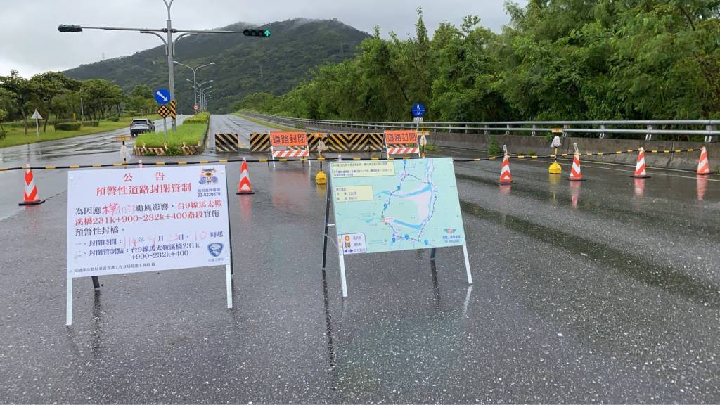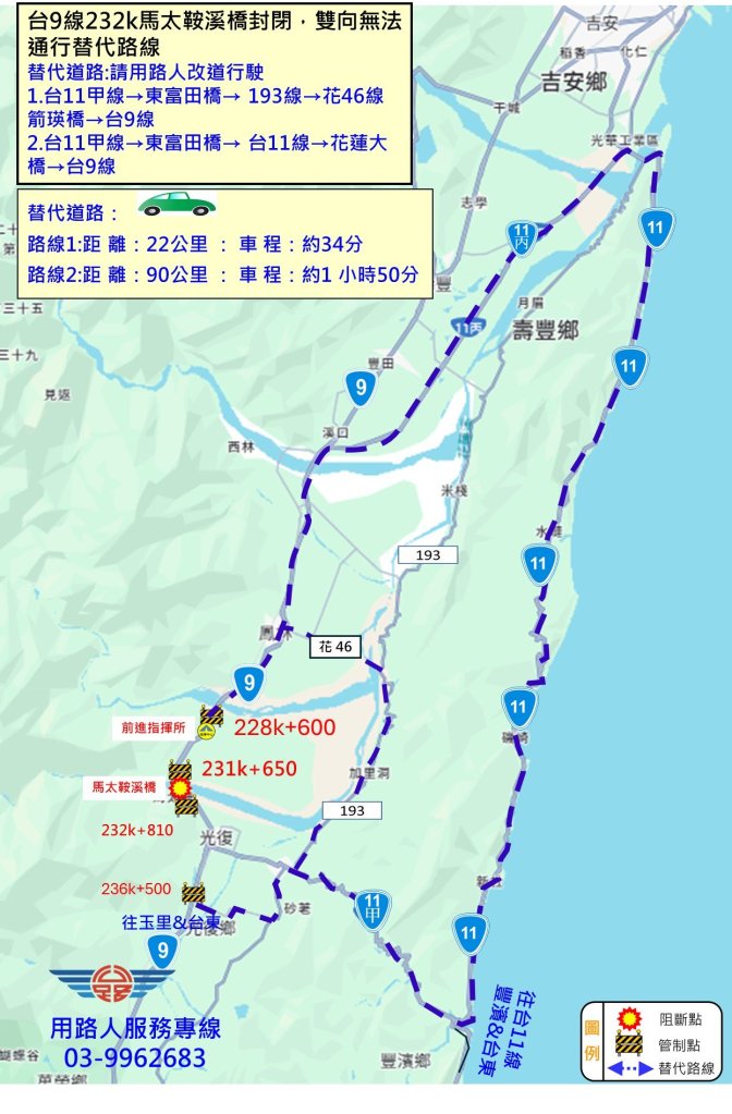 「馬太鞍溪上游堰塞湖」受強烈颱風樺加沙影響降雨量增大及依林保署花蓮分署通知,天然壩預估於今日中午前後發生溢流,交通部公路局東區養護工程分局花蓮工務段已派員於高處觀察河川水位變化,目前已於今日上午10時完成馬太鞍溪橋南北端橋梁封閉作業(台9線231k+650、232k+810)、並依據林保署提供之溢淹範圍圖,向南北延伸至台9線228k+600(長橋路段)及台9線236k+500(光復路段)實施封閉車道,管制南下、北上各開放一內側車道供車輛通行,以因應當洪水暴漲時,縮短封路時間,後續將視水位變化不排除全線道路封閉通行。