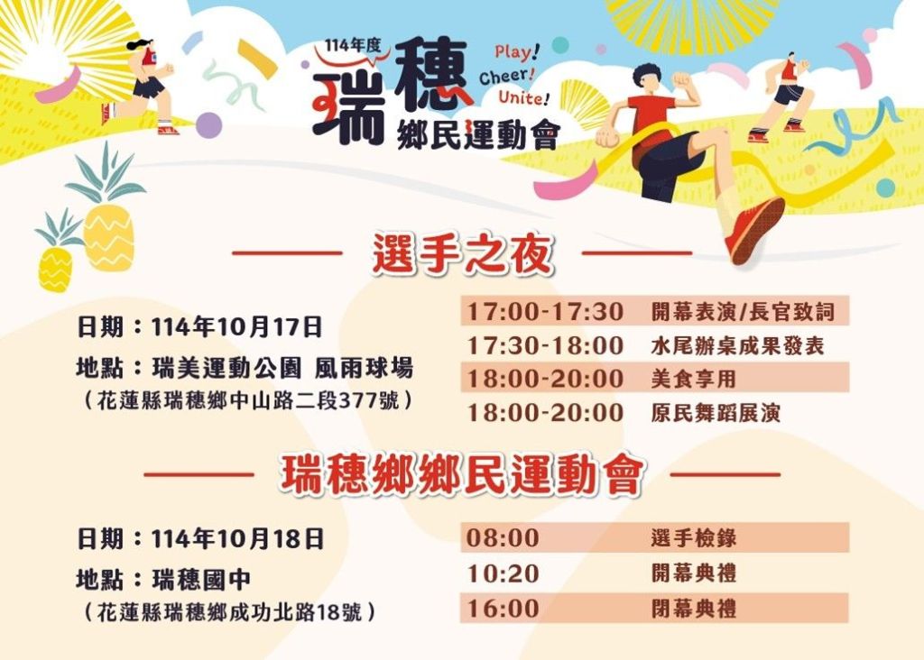 接著10月18日(星期六)早上八點半,假瑞穗國中操場舉行【鄉民運動會】,各村代表齊聚競賽,展現團結與拚搏!瑞穗鄉公所誠摯邀請大家全家出動,一起感受瑞穗的熱情與活力!讓我們一起用運動的熱情,為瑞穗加油、為花蓮祈福。