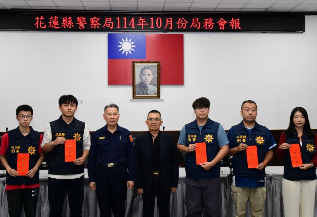 花蓮縣警察局召開10月份局務會報,會中由花蓮縣警察之友會常務監事劉敏賢代表頒發破案獎金,表揚偵破重大刑案有功人員。本次受獎案件計有販毒集團、組織犯罪、恐嚇、公共危險、詐欺車手團以及強盜、搶奪等16件,展現警方積極維護治安的決心與成效。