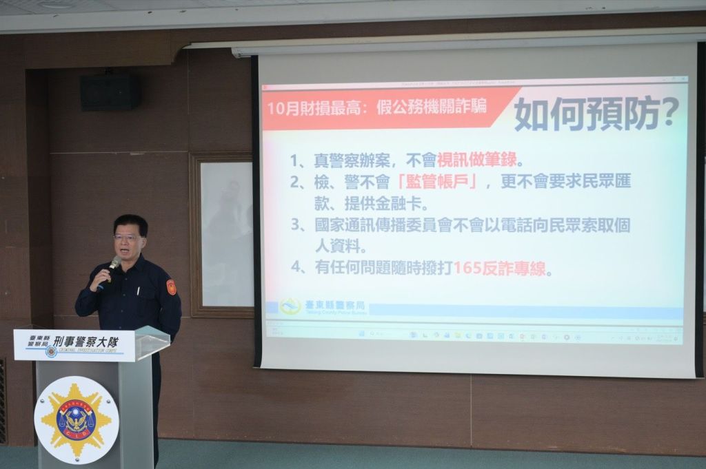警察局魏仲亨副局長指出,根據內政部警政署165打詐儀錶板顯示,臺東縣於上(10)月間共發生67件詐欺案件,總財損為新臺幣2,273萬元,前5大高發手法中依序為「網路購物」、「假投資」、「假銀行借貸」、「色情應召詐財」及「假公務機關」詐騙手法,提醒民眾留意假網路購物詐騙,並解析收到「詐騙包裹」的處理管道;而財損金額最高為假公務機關詐騙,總財損為新臺幣1,023萬元,佔整體45%,近期「普發1萬元」政策亦成為不法集團行騙話術,藉此機會與郵局聯手宣導,盼提高大眾識詐知能。