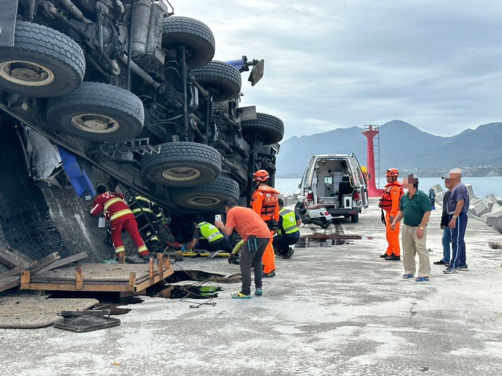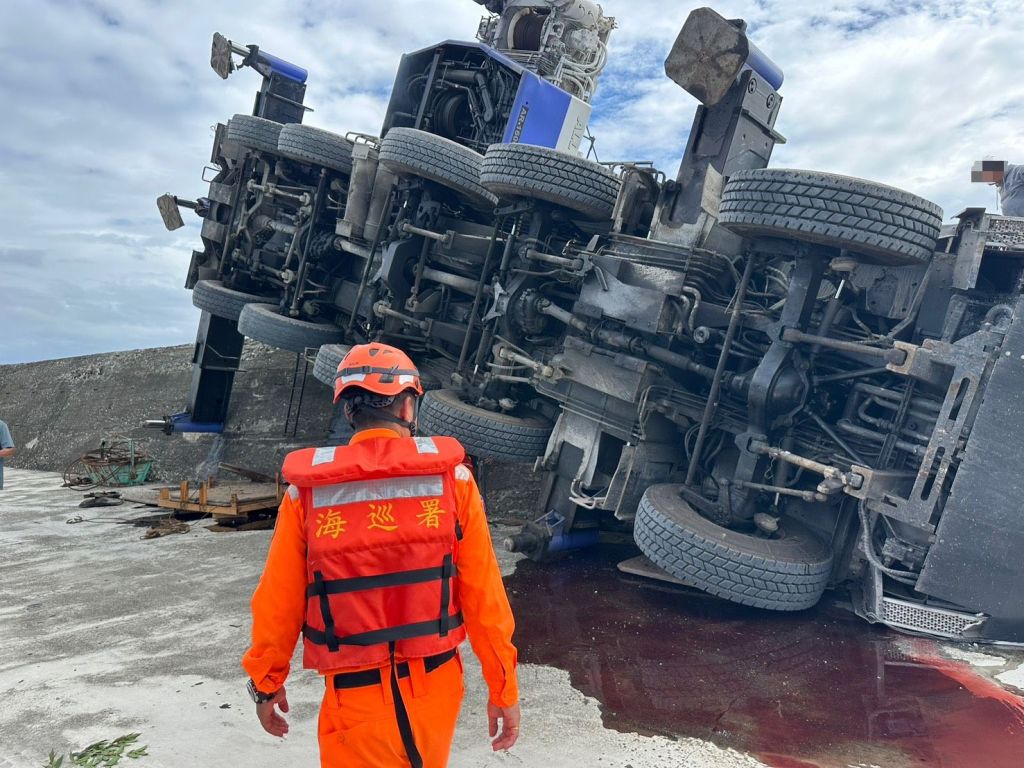 海巡署東部分署第一三岸巡隊新港漁港安檢所執勤人員於30日上午11時25分操作港區監視糸統時,發現港區紅燈塔處有一輛吊車翻覆,即啟動救援機制。同步回報第十巡防區指揮部應處,並通報臺東縣消防局成功大隊成功消防分隊、海洋保育署臺東海洋保育站及臺東縣環境保護局等單位協處。