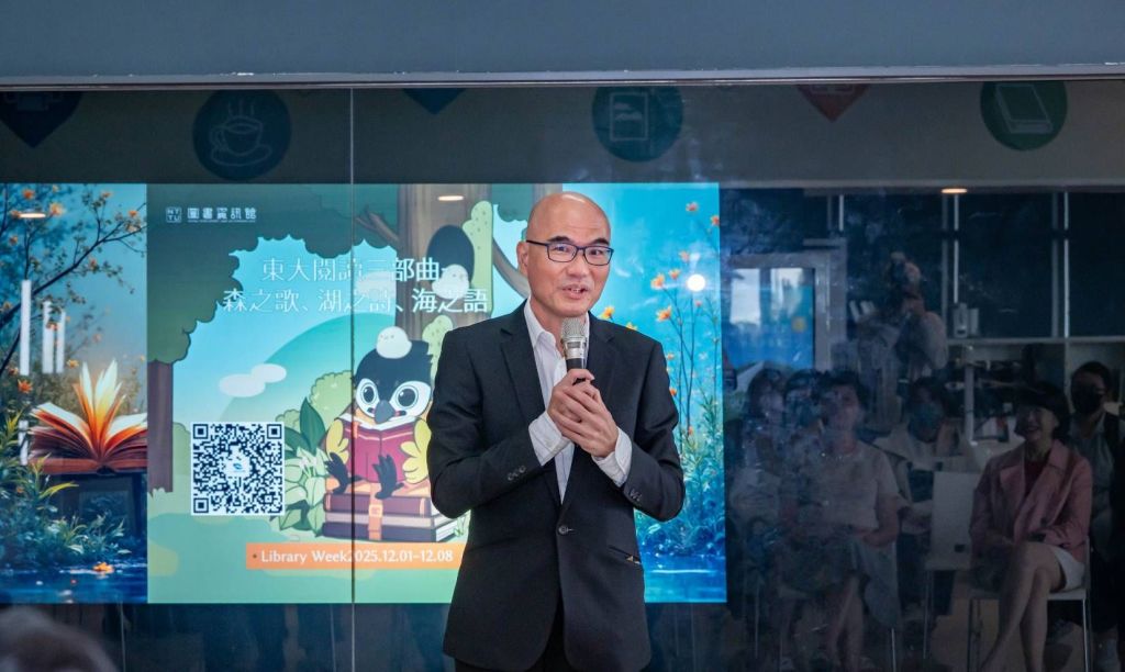 鄭憲宗校長在致詞中感謝圖書資訊館長期在館藏、數位服務與各類活動推動上的努力,使圖書館在教學與研究支援上扮演重要角色。他指出,臺東大學位於山海相擁的環境,今年主題「森之歌、湖之詩、海之語」象徵閱讀能走出館舍,在自然中延展出新的視野。