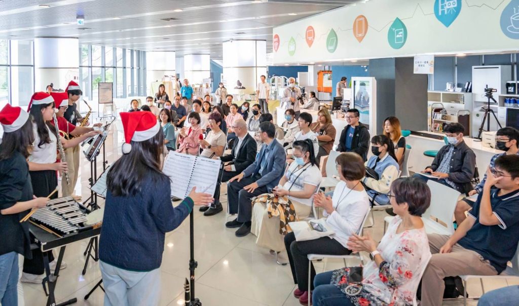 國立臺東大學圖書資訊館舉行「2025 圖書館週」開幕活動,今年以「東大閱讀三部曲──森之歌、湖之詩、海之語」為主題,象徵閱讀在山林、湖畔與海洋之間延伸與展開。圖書館週期間規劃展覽、講座、工作坊與閱讀推廣等多元活動,邀請全校師生共同參與。開幕活動由本校管樂社演奏揭幕,更邀請校長、館長、副校長、學務長分別手持沙鈴,與管樂社一起演奏,使得活動氣氛更為活潑、親切。