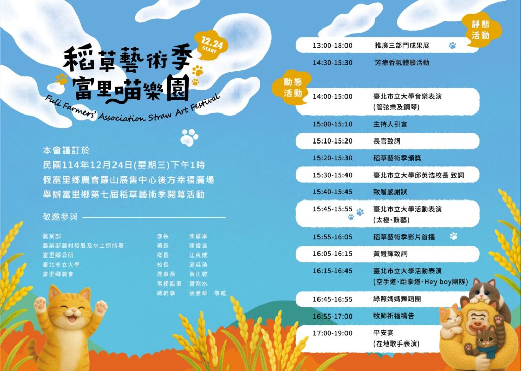 為深化農村文化特色、推動地方創生與觀光發展,富里鄉農會以「藝術 × 農村 × 萌貓」為主題,策劃推出《富里喵樂園》主題展覽,透過藝術創作與農村景觀結合,展現富里鄉多元且具創意的農村風貌,邀請民眾走進田園,感受農村生活的溫度與文化魅力。