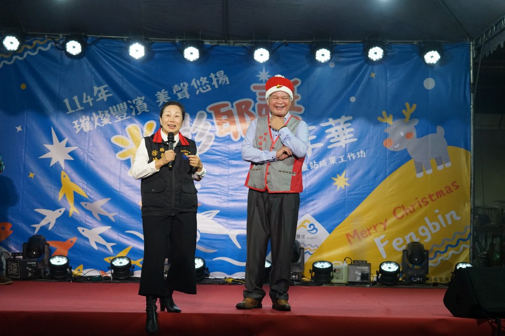 豐濱鄉長邱福順於致詞時表示,肯定參與聖誕布置與舞台演出的教會、文化健康站及表演單位用心投入,透過燈飾與多元節目安排,讓不同世代接力登台,共同為豐濱營造溫馨而熱鬧的耶誕節慶氛圍;同時也指出,透過光影耶誕嘉年華活動,不僅凝聚鄉親情感,也展現文化健康站一年來深耕社區的成果,未來將持續辦理多元節慶與藝文活動,為豐濱注入更多溫度與活力。