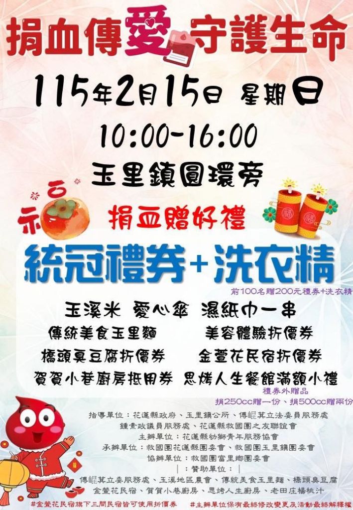 2月15日(星期日)上午10:00至下午16:00,在玉里鎮圓環旁,救國團玉里團委會邀請你,為過年期間的醫療用血,多留一份希望。你付出的,只是一點時間;他得到的,卻是活下去的機會。