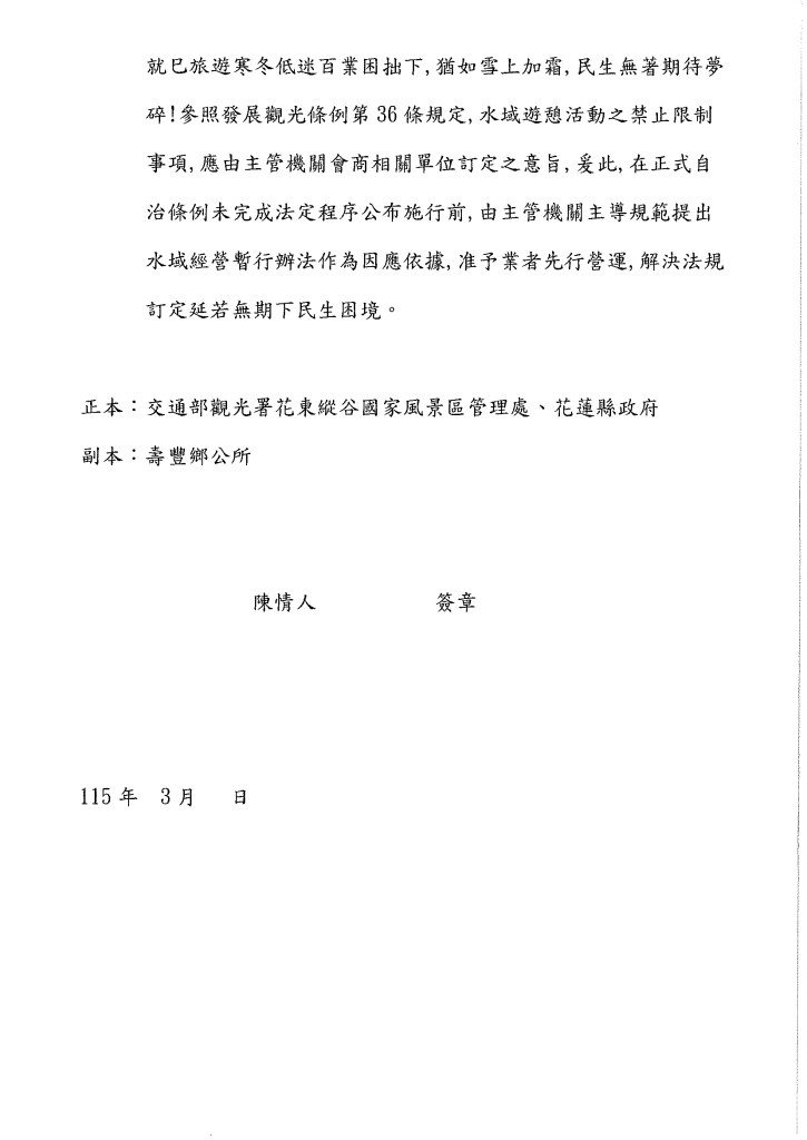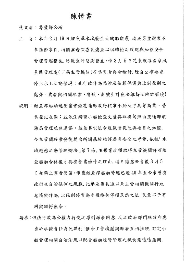 壽豐鄉長曾淑懿12日接下池南村長張清飛與鯉魚潭商圈發展協會理事長林盈裕陳情書,希望公所代轉給花東縱谷國家風景區管理處、花蓮縣政府,商圈業者爭取在法規空窗期,由主管機關提出水域經營暫行辦法作為因應依據,准予暫時營運,不要置業者生計於不顧,讓鯉魚潭商圈業者陷入困境。