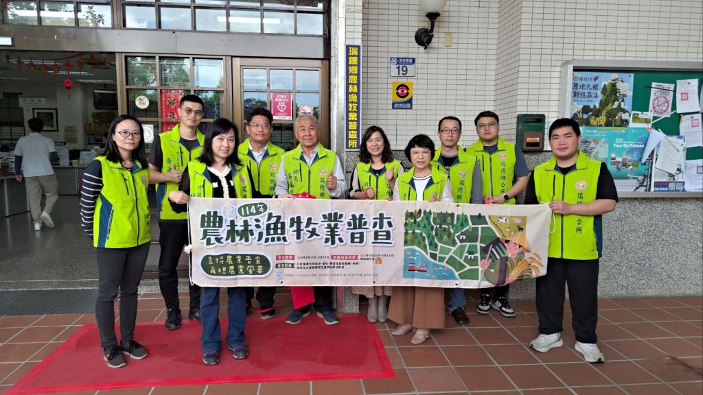 114年農林漁牧業普查將於115年4月10日至115年6月30日全面展開,為順利推動普查工作,花蓮縣瑞穗鄉公所於115年3月16日成立「花蓮縣瑞穗鄉農林漁牧業普查所」,並在鄉長吳萬德率領公所團隊下舉行掛牌典禮,宣示普查作業正式啟動,期盼透過完善的普查作業,掌握地方農林漁牧產業發展現況,作為未來政策規劃的重要依據。