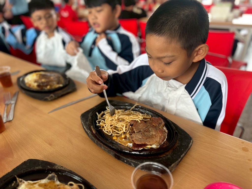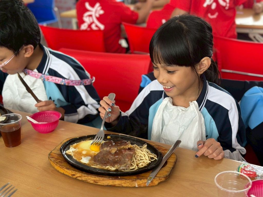中午用餐時段,涼爽的天氣更添愜意,志工團隊分工合作,端出熱騰騰的玉米濃湯與清涼紅茶,現場現煎牛排香氣四溢,讓人食指大動。學童們開心享用難得的豐盛餐點,臉上洋溢著純真的笑容,為活動增添溫馨畫面。
