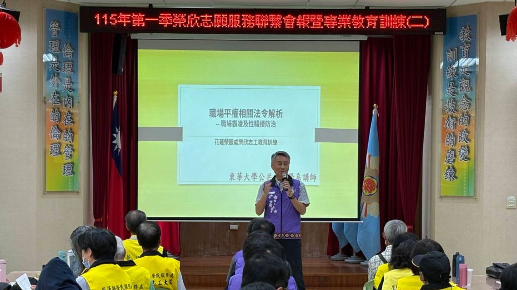 花蓮縣榮民服務處為推展志願服務工作、凝聚志工團隊向心力並提升專業知能,今(10)日舉辦「志願服務專業教育訓練」,並結合第一季榮欣志工服務聯繫會報同步進行。活動課程規劃多元豐富,吸引眾多志工夥伴踴躍參與,現場互動熱絡,展現志工團隊高度學習熱忱與凝聚力。