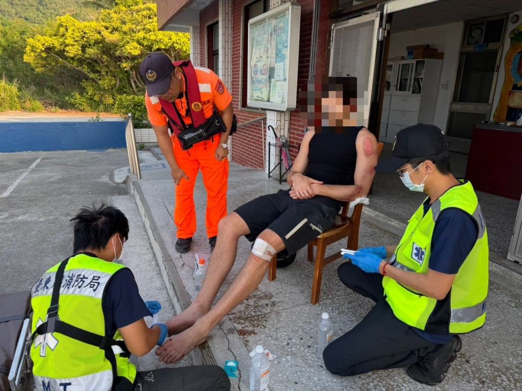 經初步了解,該名衝浪客因野狗突然竄出車道,閃避不及而失去重心倒地。金樽安檢所立即通報臺東縣消防局成功大隊東河消防分隊派員協處,並由檢查人員於現場先行檢傷評估,發現傷患左腳背有擦挫傷,左肩膀出現瘀青且無法抬舉,惟意識清楚、生命徵象穩定,其餘部位暫無明顯外傷。為確保傷患安全,檢查人員隨即攙扶其返回安檢所內休息並持續觀察,待東河消防分隊人員抵達現場接手包紮並後送臺東基督教醫院。