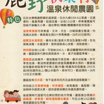 記者 閔茹/鹿野報導 鹿野溫泉休閒農園開放囉!原本由鹿野鄉農會所經營的溪遊季溫泉在歇業多年後,經由民間企業斥資 … More 看熱氣球泡溫泉 來鹿野溫泉休閒農園就對了